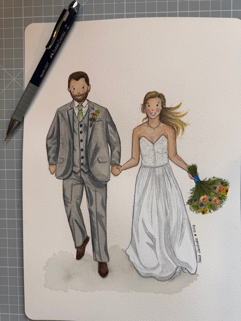 I specialise in creating hand-painted and digital illustrations of weddings, new babies, cute kids, birthdays, homes...anything! I paint from your photographs and I adore being all cosy in my art studio with a mug of tea as I illustrate your memories